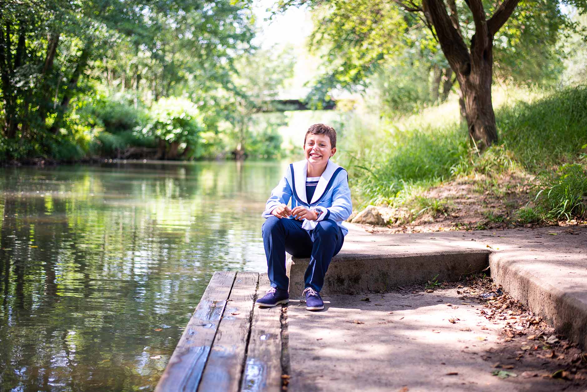 La sesión de fotos de comunión de Sergio la realizamos en la senda del Nora de Pola de Siero. Fue una tarde muy divertida en la que jugamos un rato tirando piedras a rio, vimos los patos y nos reímos un montón, no hay mas que ver a Sergio!
